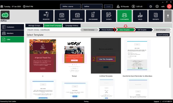 Step 4: After completing the above steps you will be taken to the next step which is Select Template (1). Select one of the existing templates. Once selected, click on the Use this Template button (2) which appears.
