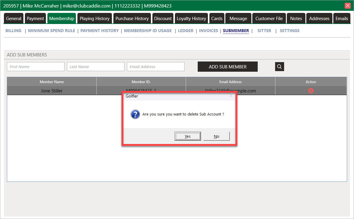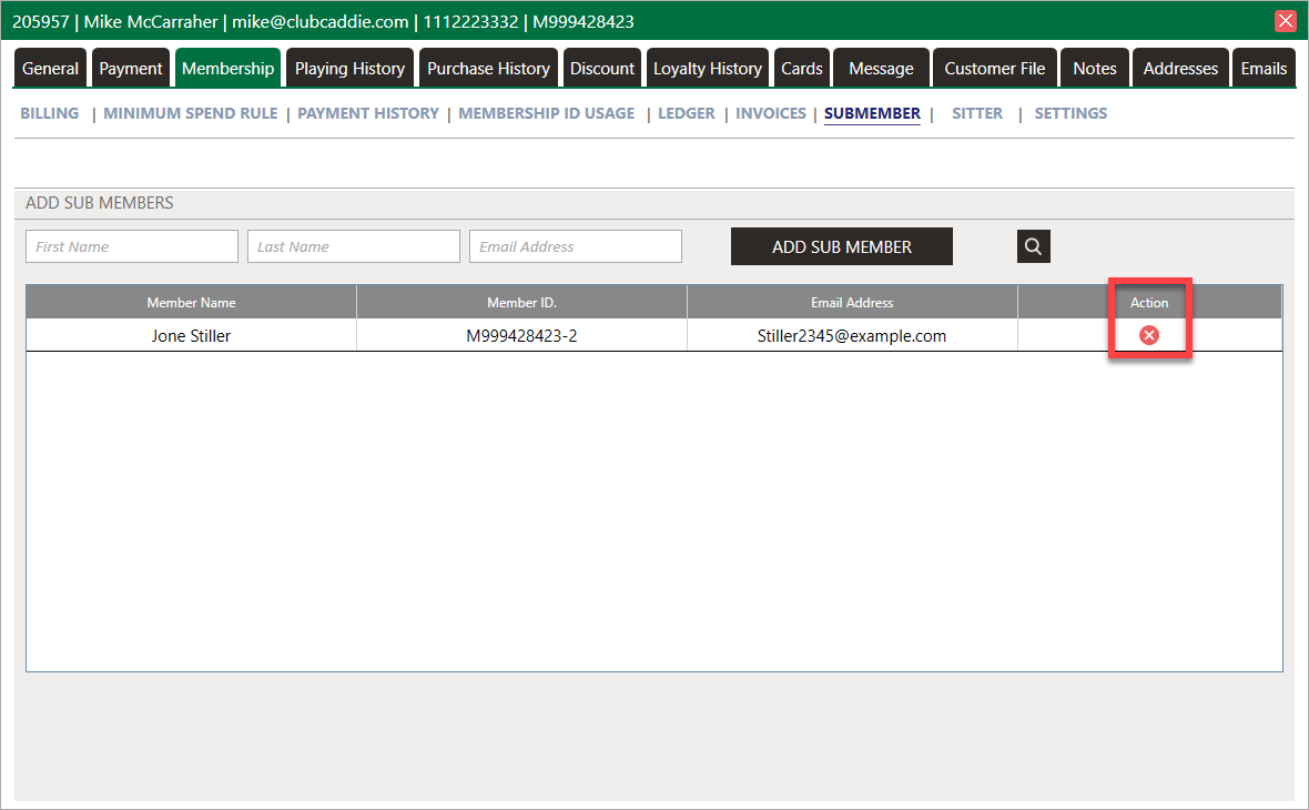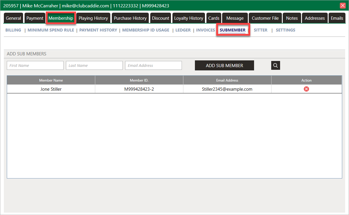 Step 3: To remove a sub-member from a primary account, open the Primary Member profile from the Members tab. Click on the Membership tab, then Sub member.