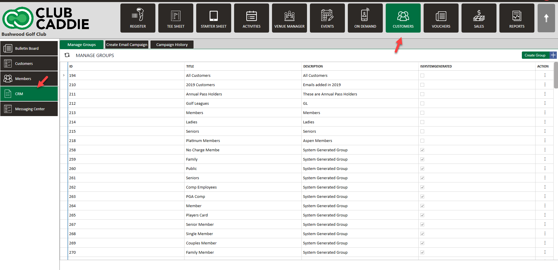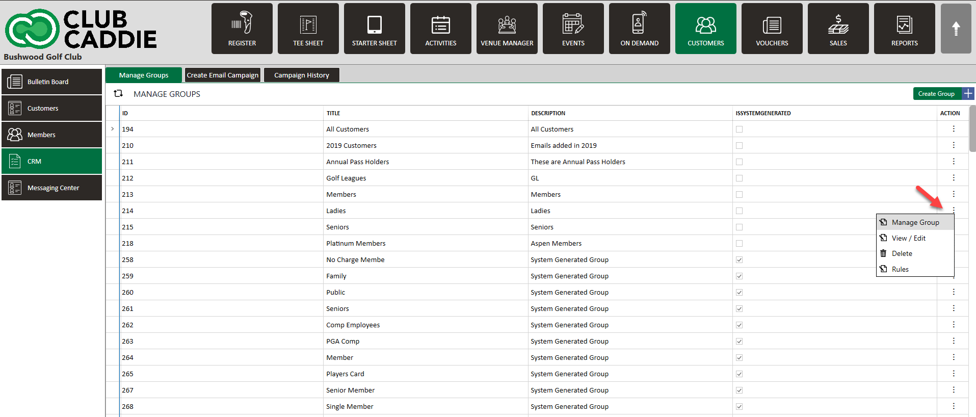 Step 4: To add or remove customers from groups then click on the Manage Group button of that group within the ACTION menu. The system will generate a new MANAGE GROUP window.