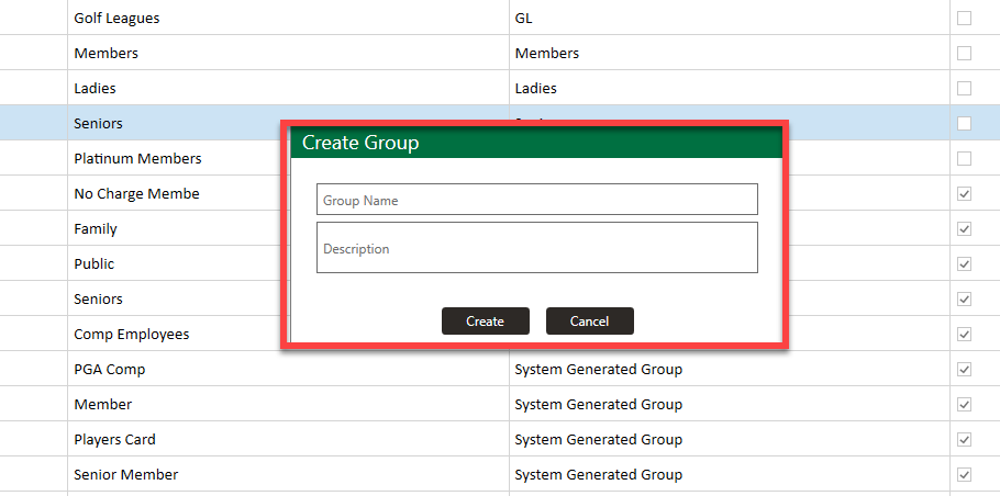 Step 3: The system will generate a new Create Group pop-up window. Give a group name and enter the group description in the provided text boxes, then click on the Create button to create a Group.