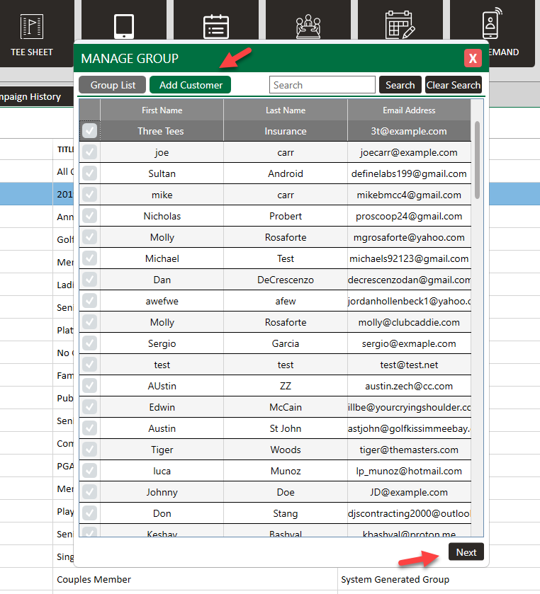 Step 6: Click on the Add Customer button to add new customers to a group. Select the customer then click on the Next button. The customer will be added to the group.
