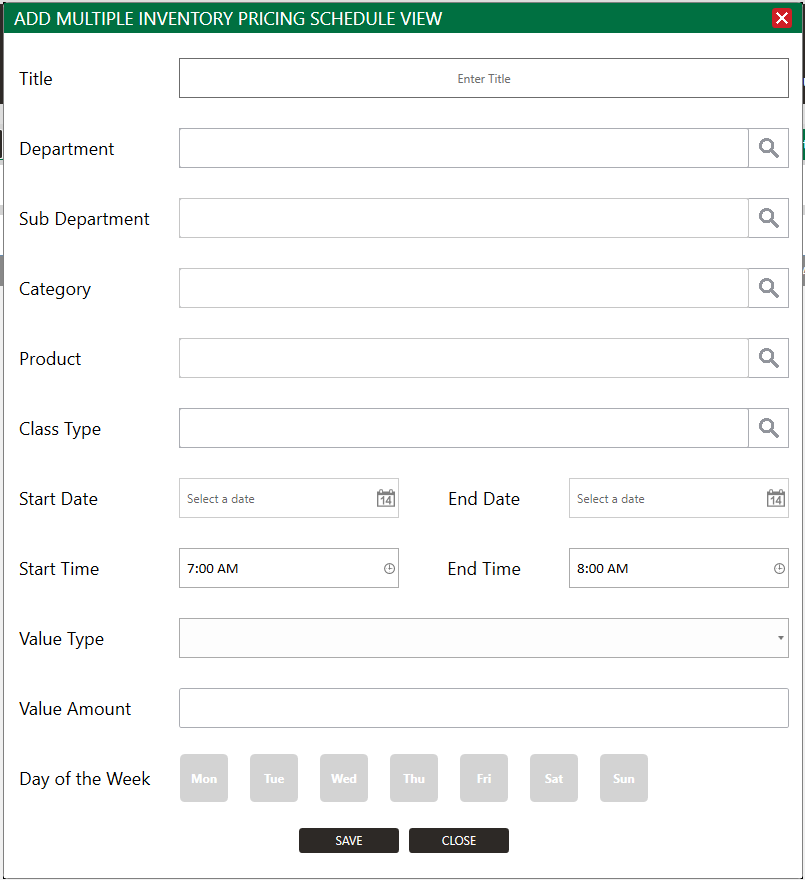 The Multiple Inventory Pricing Schedule applies time-based price adjustments, happy hours, and promotional discounts across an entire Department, Sub Department, or Category at once. For F&B operations with large item catalogs, this eliminates the need to configure each item individually.