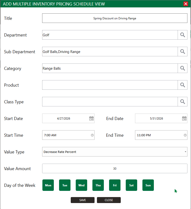 Step 4: Set the Start and End Date, Start Time and End time, and choose the pricing adjustment details including the discount type by selecting from the Value Type then the Value Amount. Select the active days of the week, and the start and end times. Click Save when finished.