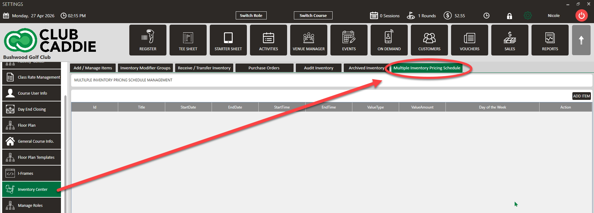Step 1: Open Settings via the gear icon in the top right corner, then navigate to Settings → Inventory Center. Select the Multiple Inventory Pricing Schedule tab. This tab handles bulk, group-level pricing schedules and is separate from the per-item pricing schedule that lives on individual inventory items.