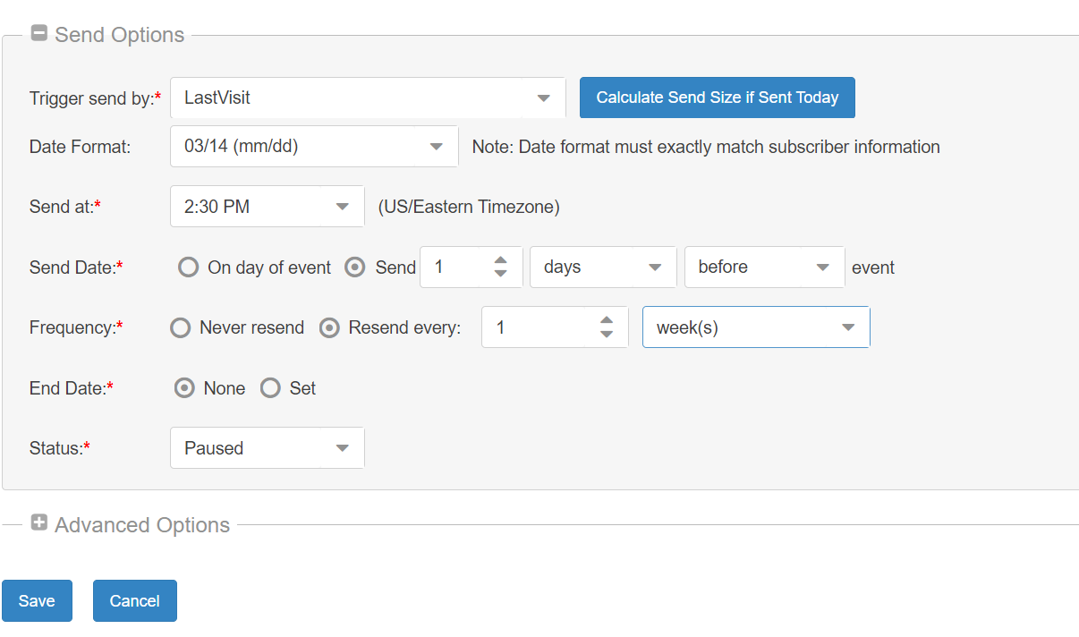- Status: Keep Paused until absolutely ready to start sending the message to subscribers
