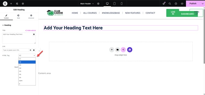 Still in the Content tab, find the HTML Tag dropdown. Choose the correct heading level (H1, H2, H3, etc.) based on your page structure. H1 is usually the main page title, and H2/H3 are subheadings.