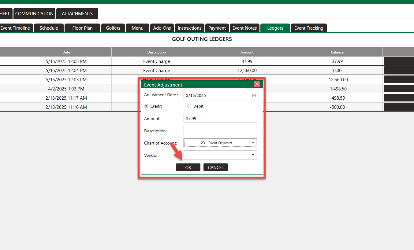 Note: You must turn on Backdated Adjustments in Event Settings before the Adjustment Date calendar will appear when making an event ledger adjustment.