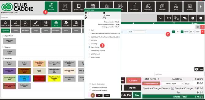 Step 2: Event Charge: Click Register, then add items that you want to purchase and to be added to the event's invoice. Then, select Pay, followed by Event Charge.