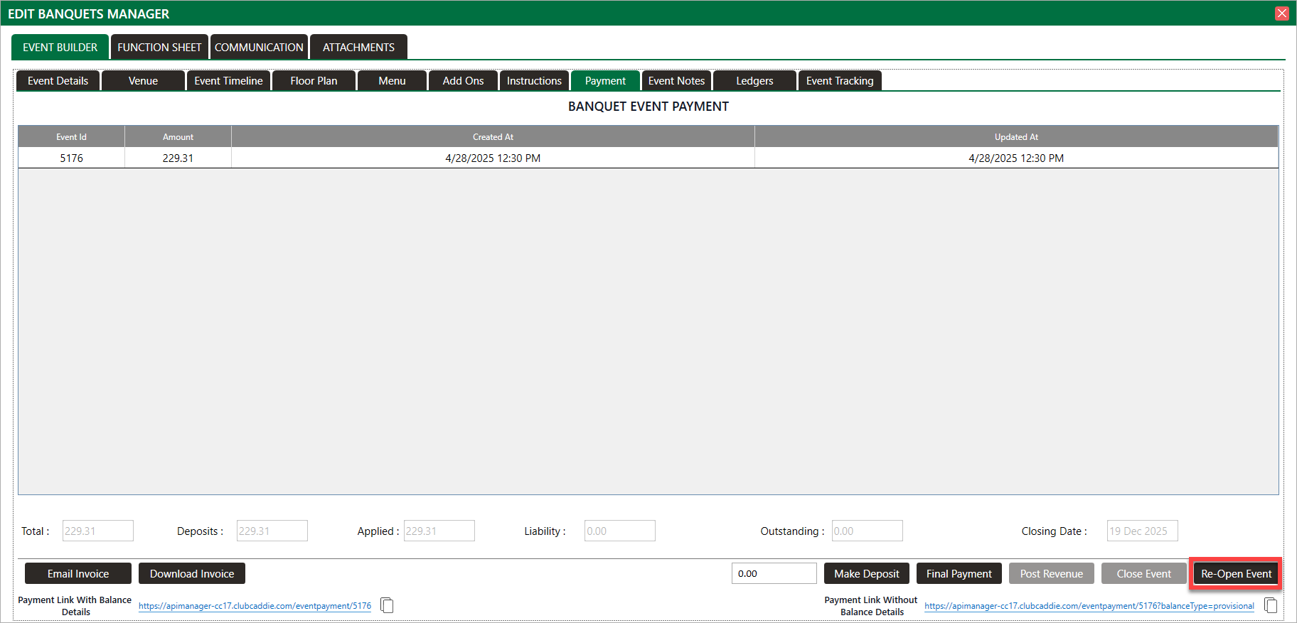 Step 4: Reopen the event if needed - If you see the event is Closed, click Reopen Event so changes can be made (adding charges and voiding post revenue are not available on a closed event).
