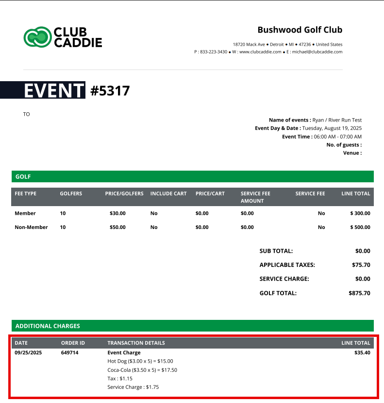 These "Event Charges" will show in the Events Module in the "Ledgers" tab of the individual event, as well as the event invoice.