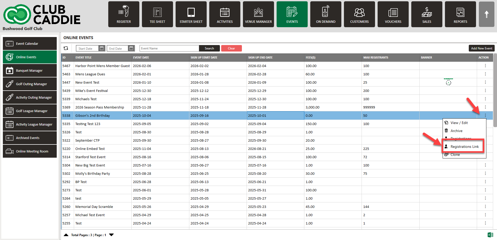 Step 2: For the event you want to promote, Select Action and Registrations Link.