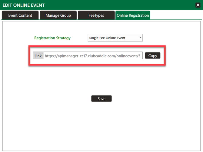 B) Select View/Edit to open the event window. Then, select the "Online Registration" tab. Here you can copy the link, and that is the link that you can share with others.