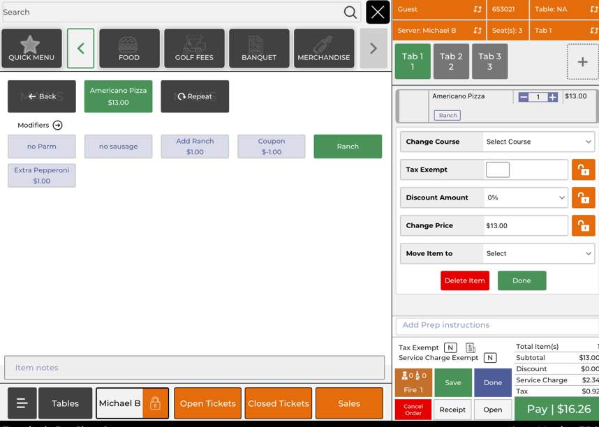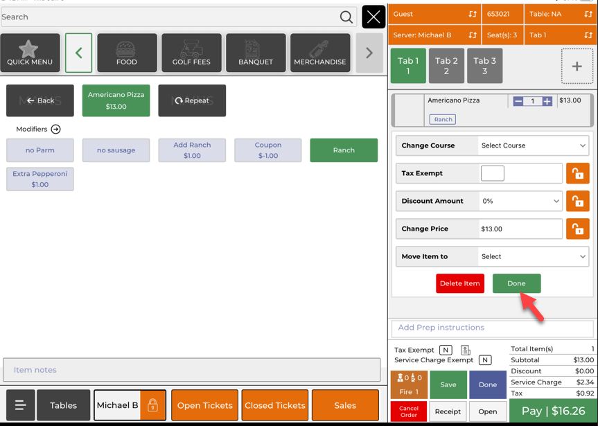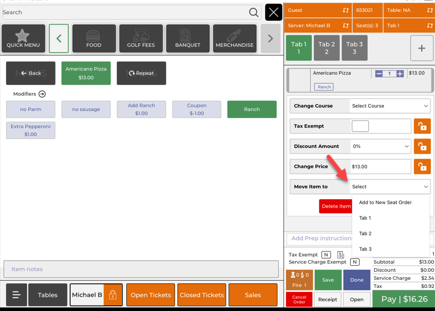 A group at the turn starts on one tab, but one golfer decides to pay separately after the order is already split. The operator opens the ticket, taps the tab with the golfer’s beverage, and uses Move Item to to send that item to a new seat order. After the system saves, the operator taps the new tab to confirm the item is there. The group can now check out with the correct items on each tab.