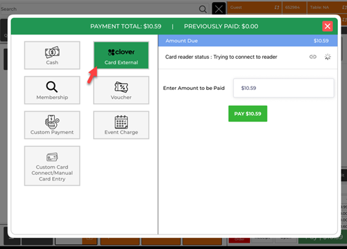 Step 4: In the F&B app, open any tab, tap Pay, then select Card External. When prompted to pair, find the 5- or 6-digit code printed on the back of the Clover Go and enter it in the F&B app to complete pairing. Once paired, the device should be recognized automatically for future transactions.