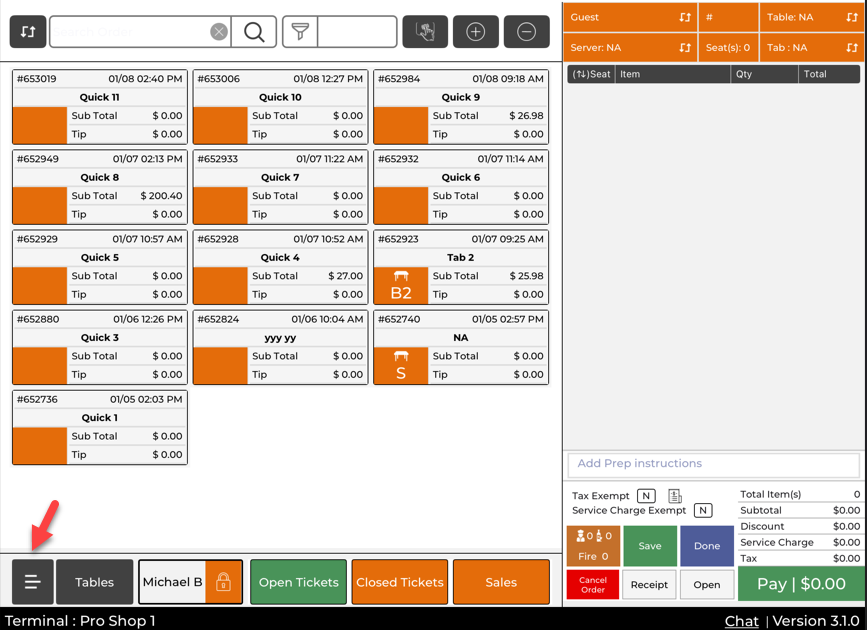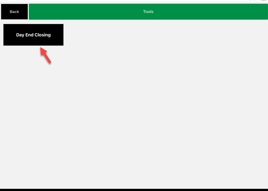 Step 1: In the F&B app, select Menu in the bottom left corner, then under Tools, select Day End Closing.