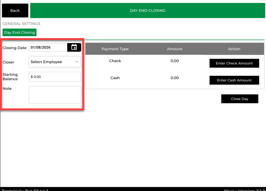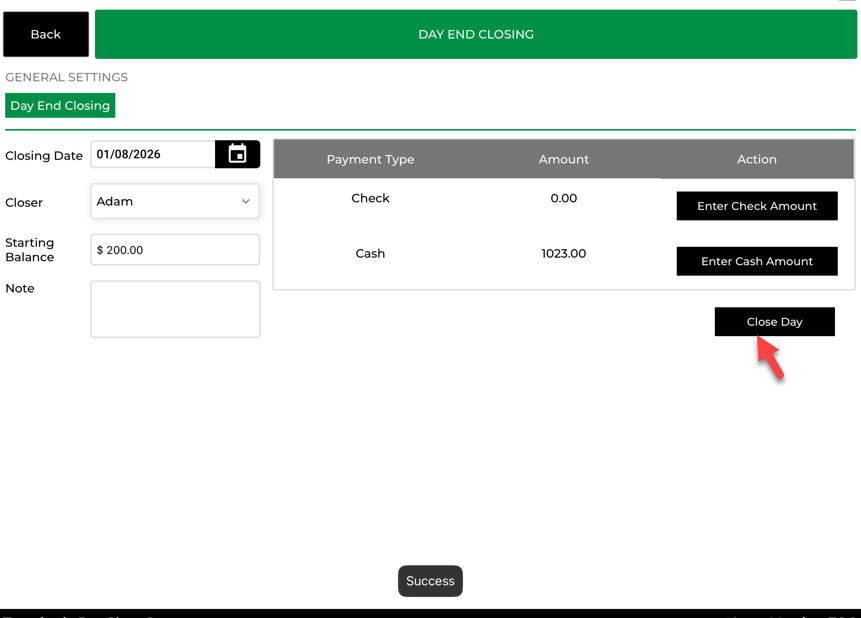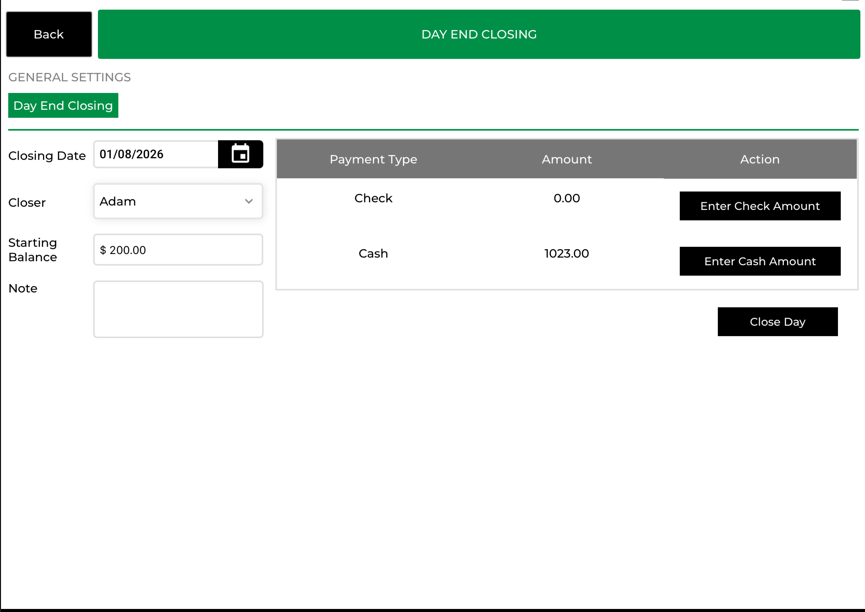 Step 6: Review the payment totals on the Day End Closing screen to confirm they match what you collected.