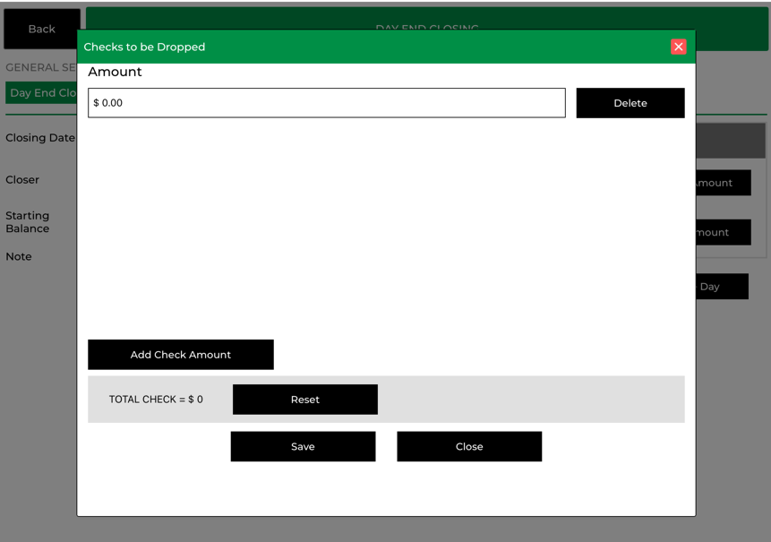 Step 2: Tap Day End Closing to open the Day End Closing window.