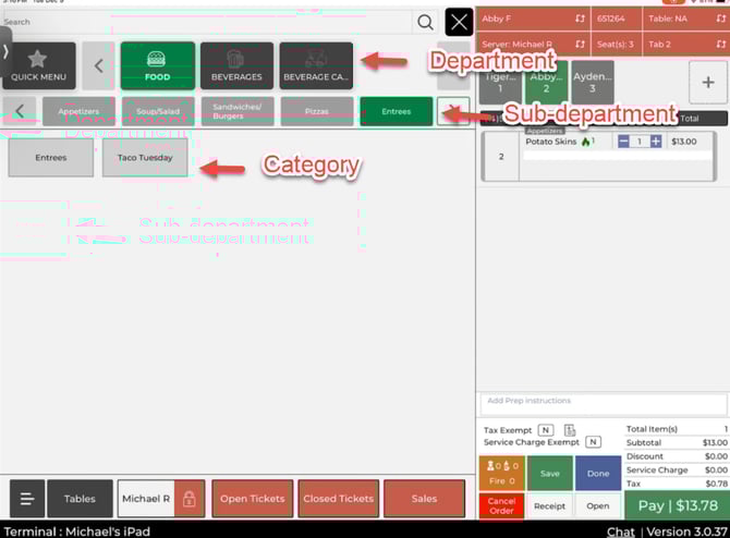Menu items are organized in a clear hierarchy to make them easy to locate: Department → Sub-Department → Category → Items. Start broad (like Food or Beverages), then narrow down until you find the exact item to add. Items will appear after you click on the category.