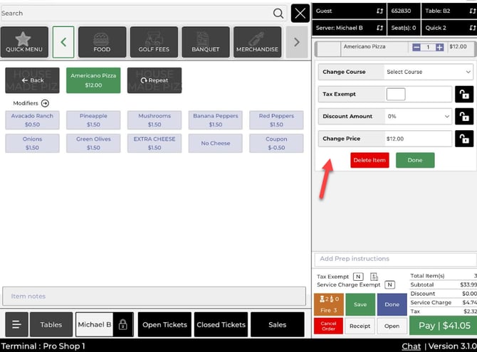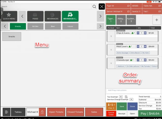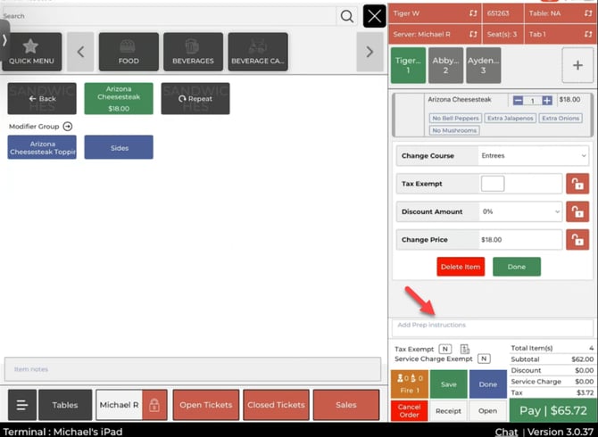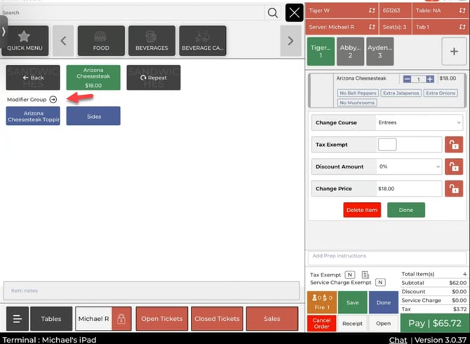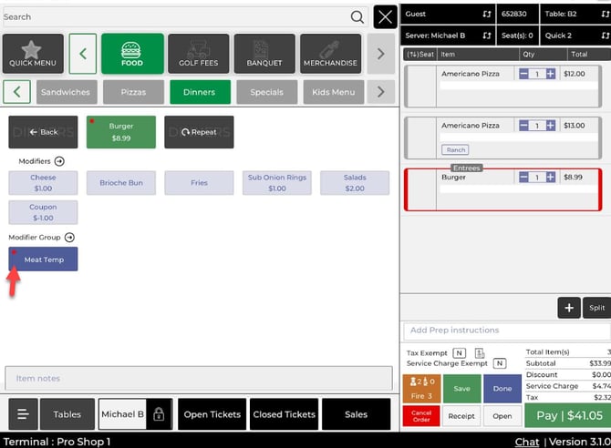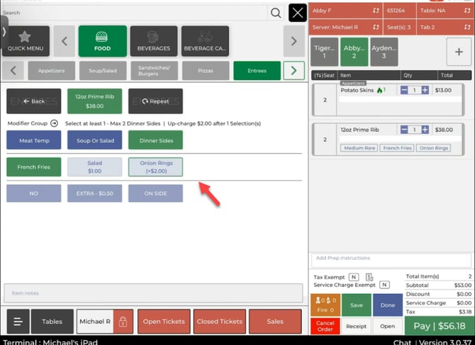 Some items require modifier selections before they can be sent to the kitchen (for example, cooking temperature, side choice, or dressings). Modifiers ensure the kitchen receives the item exactly as intended.