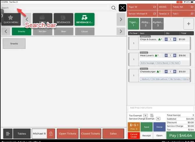Search is the fastest way to add items when you already know the item name. Start typing and select the item from the results to add it directly to the order without navigating through menu categories.