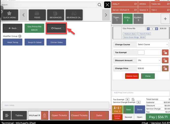The Repeat function is a quick way to add another of the same item to an order (useful for multiple drinks or duplicate items). Depending on your setup, repeated items may require modifiers to be selected again.