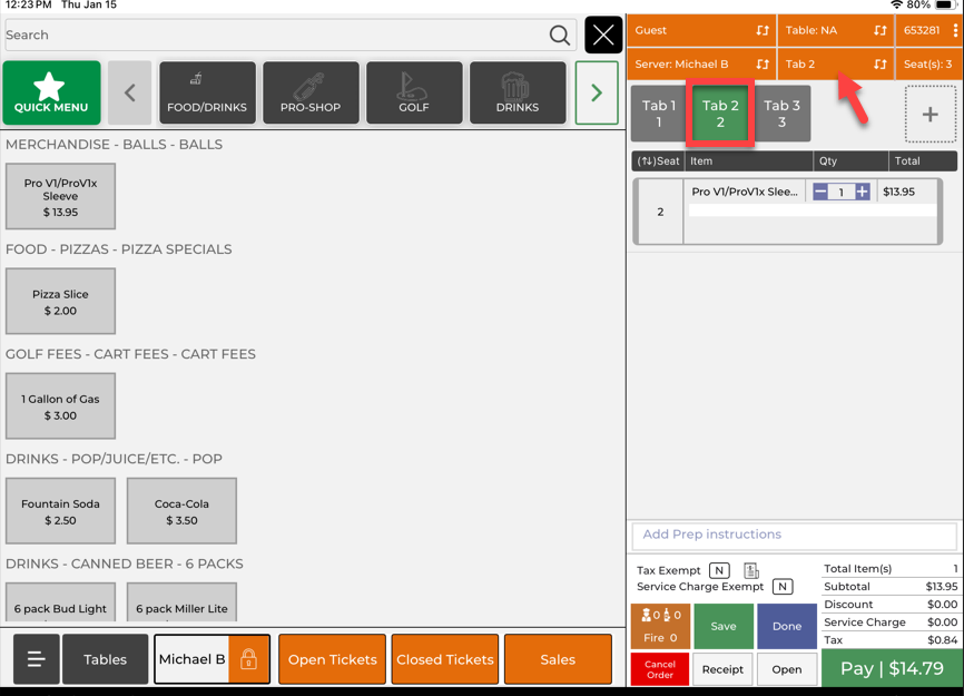 Shows all of your currently open tabs, so you can quickly return to an existing order to add items or check its status. Your tabs are highlighted in green and shown in your employee color.