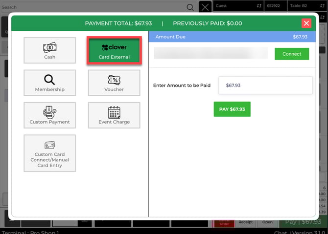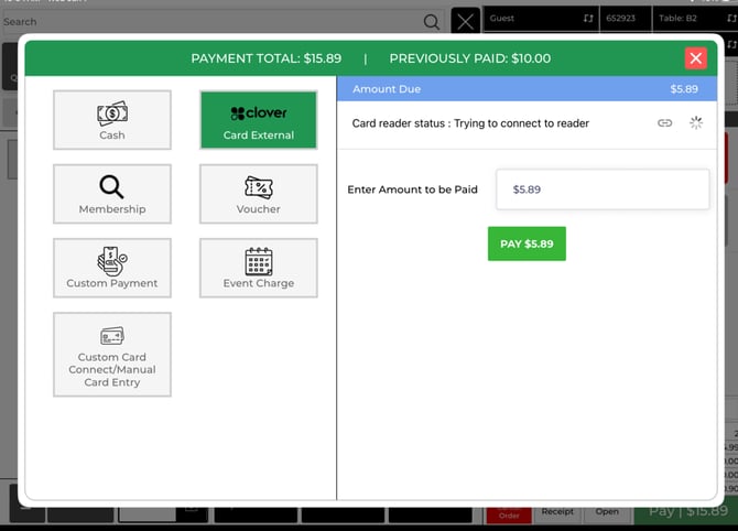 Step 4: For credit card payments, tap the card option used at your facility (commonly Card External for a Clover Go device).