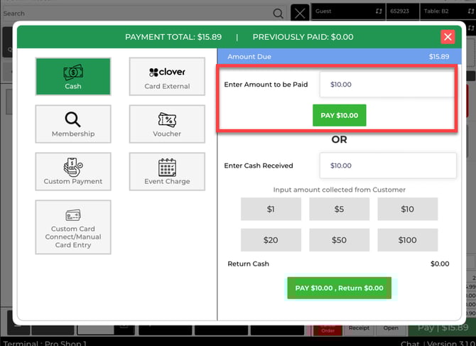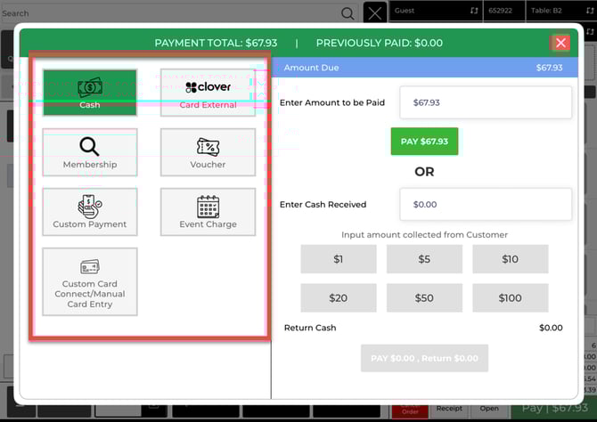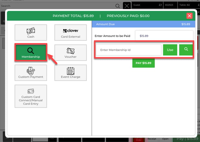 Step 2: On the payment method screen, choose how the guest is paying (Cash, Card, membership ID etc.).