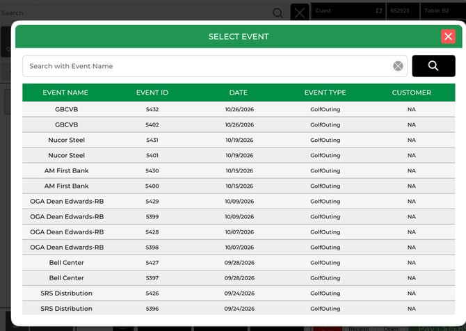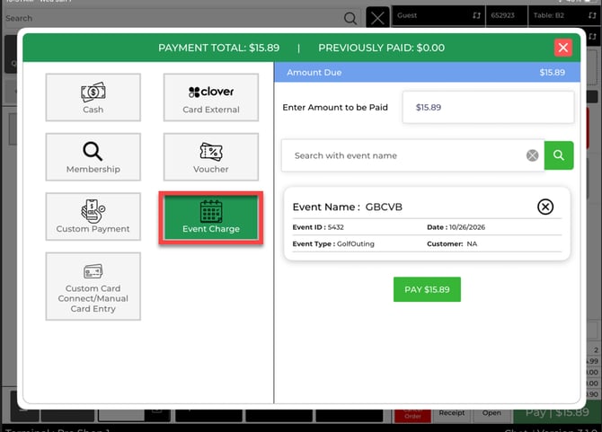 Charge to Event: Tap Pay, select Event Charge, You can either search for the event by name in the search bar, or select the magnifying glass to view the list of events.