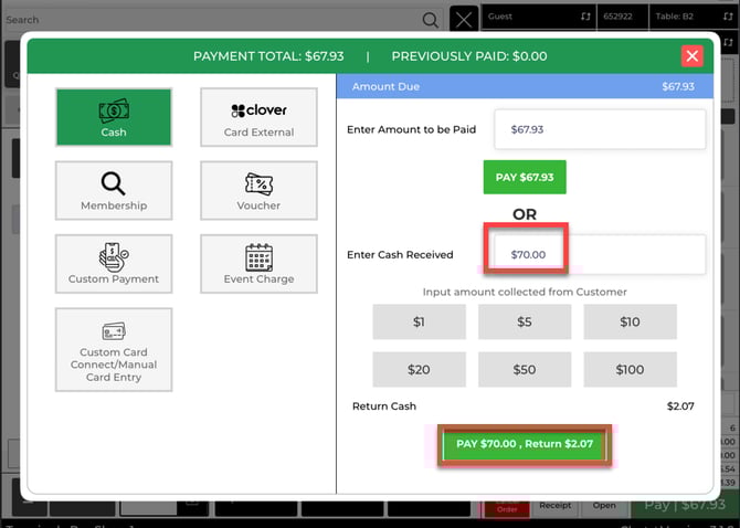 Step 3: For cash payments, tap Cash, enter the amount received (for example, enter 70.00 if the guest gives you $70), then select Pay. The system calculates the change due.