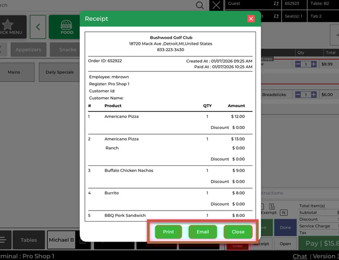 Step 5: Select a receipt option (Print, Email, or Close). Once completed, the tab closes and no longer appears as unpaid in Open Tickets.