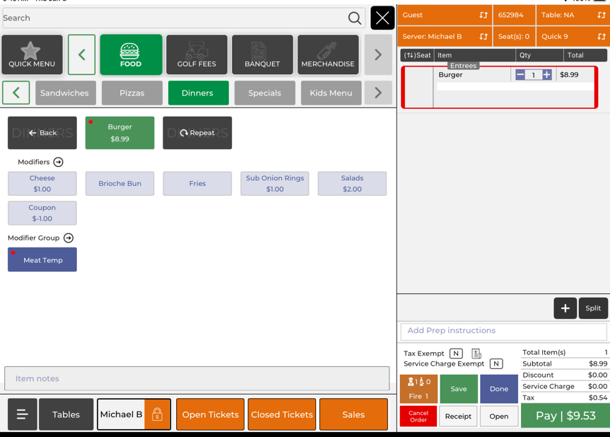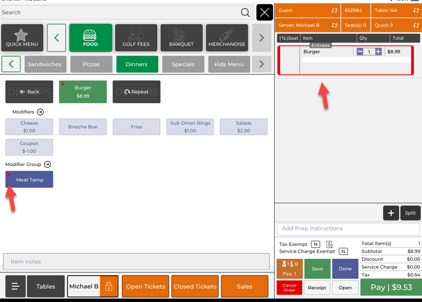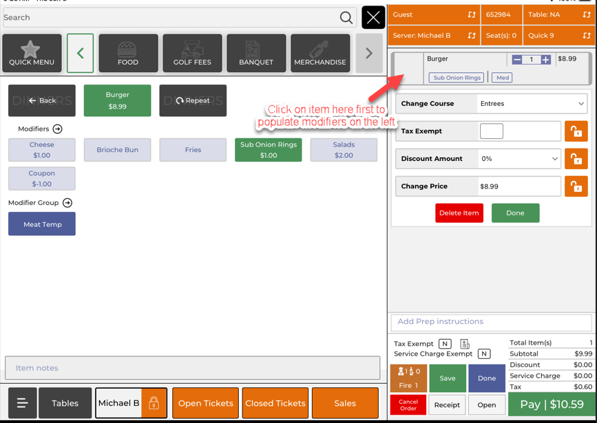 Step 6: To edit modifiers after the item is added, tap the item on the right side of the screen. Once you tab the item, the modifiers will appear on the left again to update your selections.