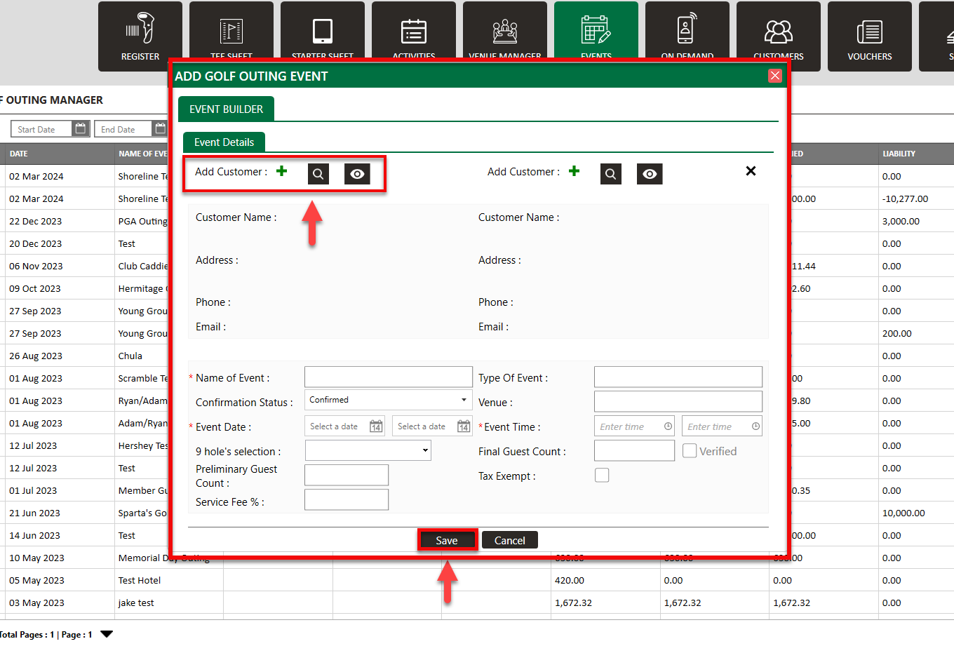 Step 3: A new customer can be added by clicking on the "+" symbol or an existing customer using the magnifying glass symbol. One or two customers can be added for creating a Golf Outing. The required fields for an event to be filled are Name Of Event, Event Date, and Event Time. Once all information is filled, click on the Save button.
