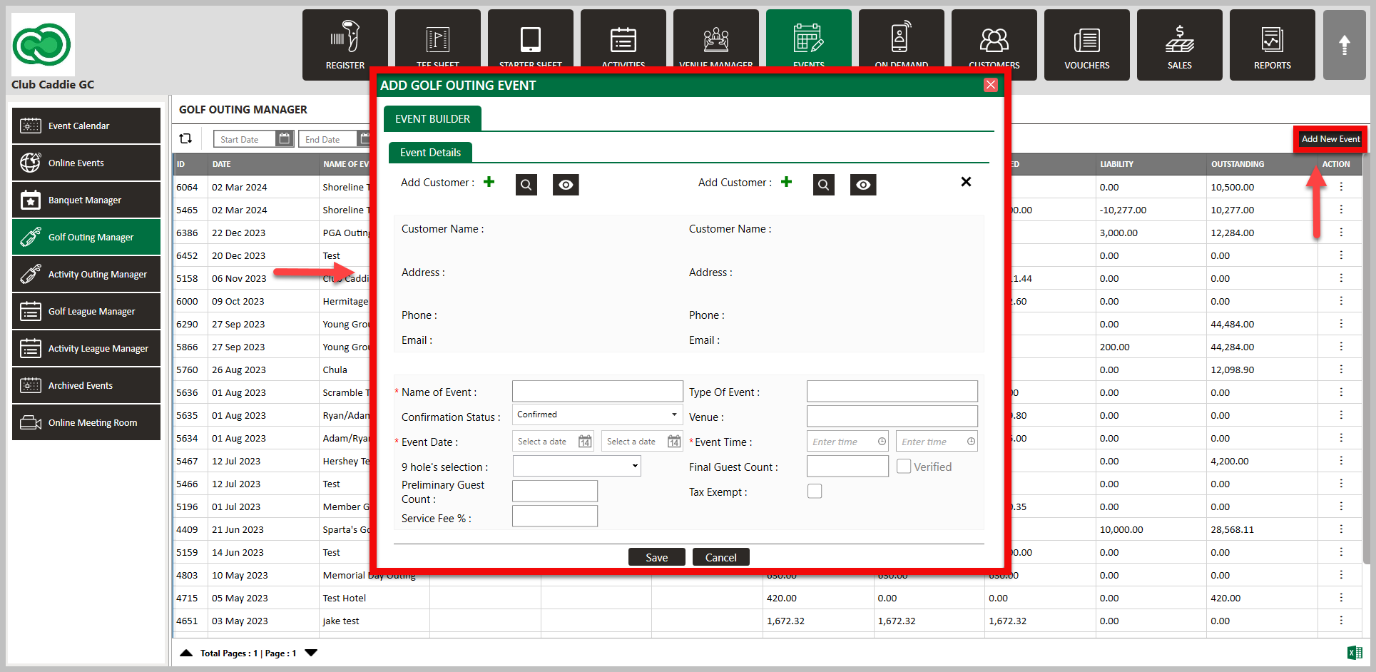 Step 2: Click on Add New Event on the right of the screen. The system will open an ADD GOLF OUTING EVENT pop-up window.