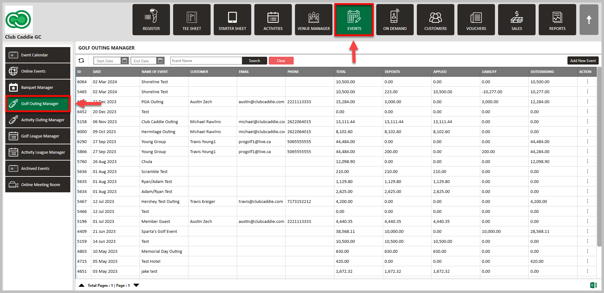 Step 1: Select the EVENTS module from the module navigation menu. Then, click on Golf Outing Manager in the left-hand menu.