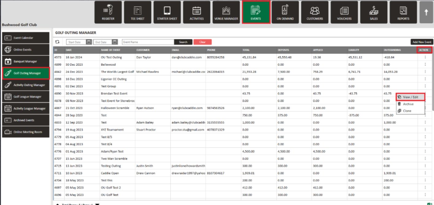 Step 1: Select the EVENTS module from the module navigation menu. Next, select Golf Outing Manager from the row on the left side of the screen. The system will show a list of Golf Outings in the GOLF OUTING MANAGER window.
