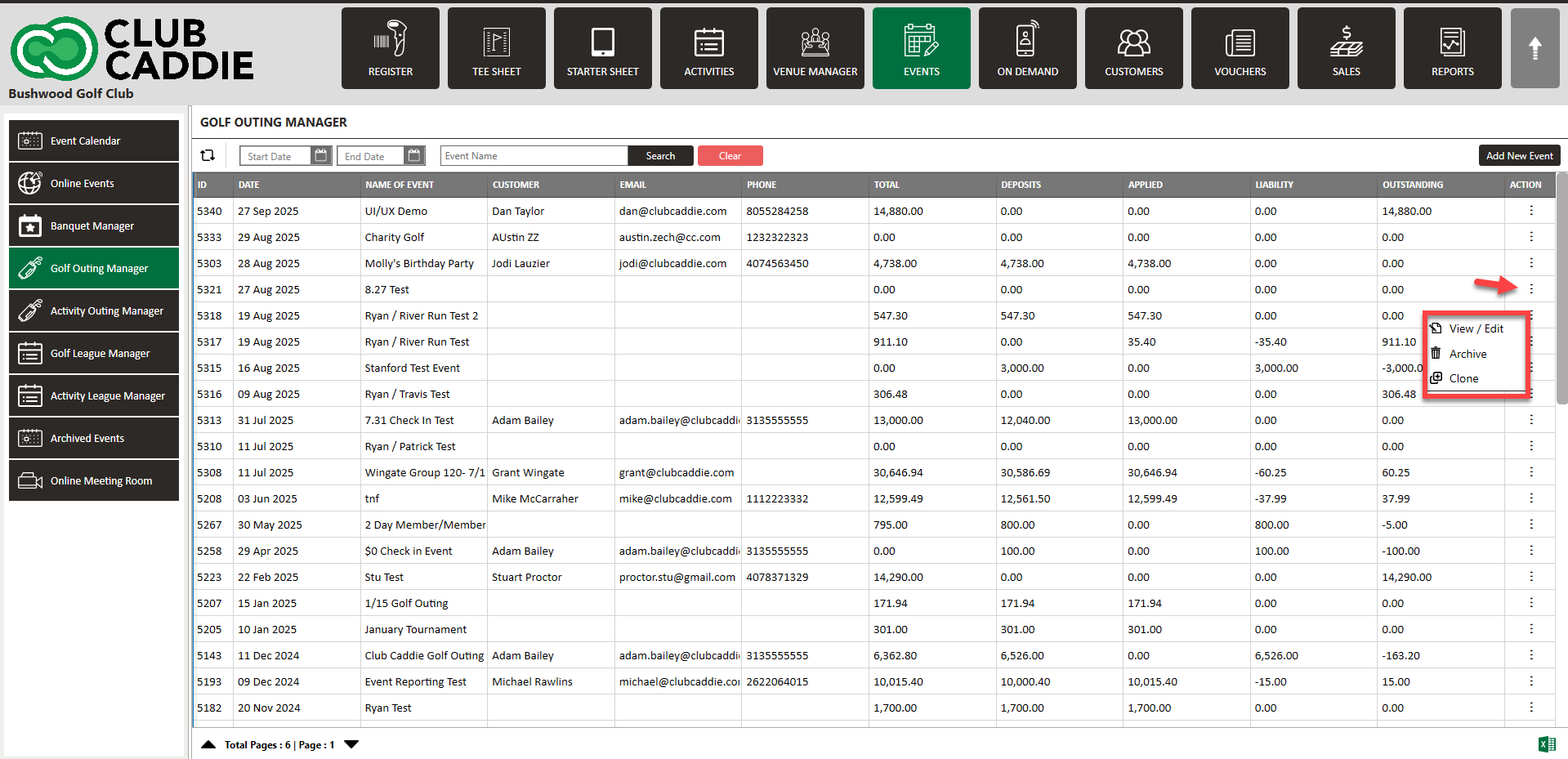 Step 2: The Golf Outing Manager shows a list of existing events. Under Action, click on the three small dots, followed by View/Edit. The System will generate an EDIT GOLF OUTING EVENT pop-up window.