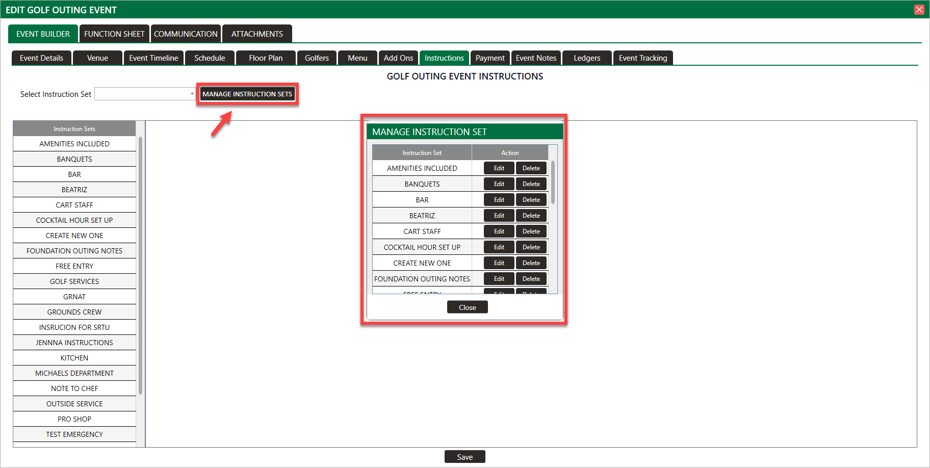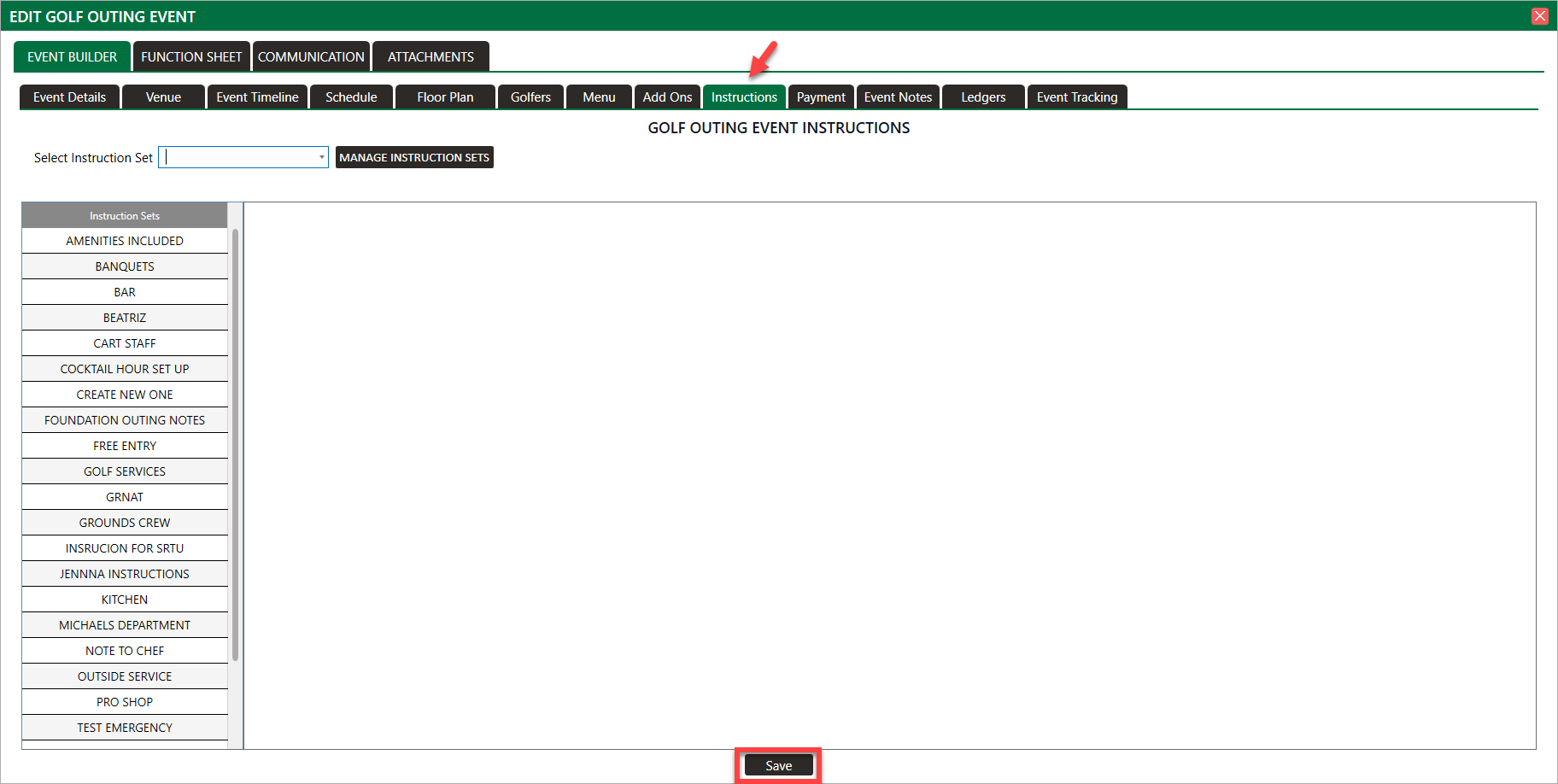 Step 4: Managing departments is possible by clicking the drop down Select Instruction Set, and chose the department. Then, enter your text, and click Save.
