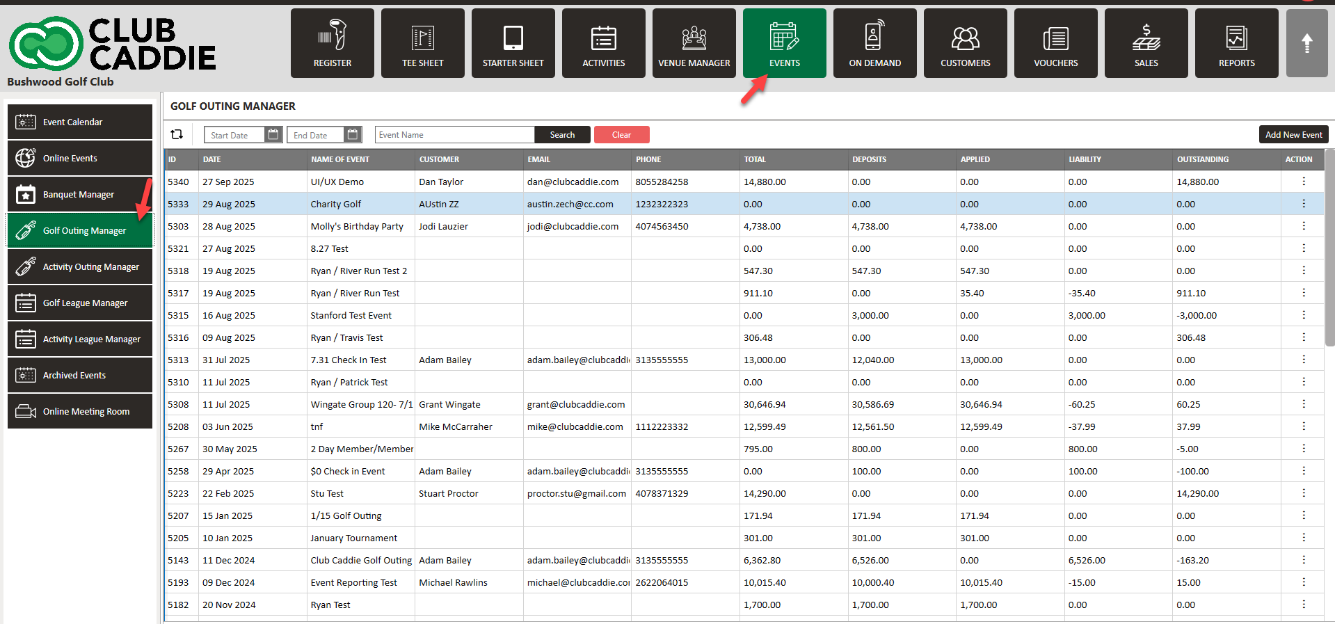 Step 1: Select the EVENTS module from the module navigation menu. Then, click on Golf Outing Manager in the left-hand menu.