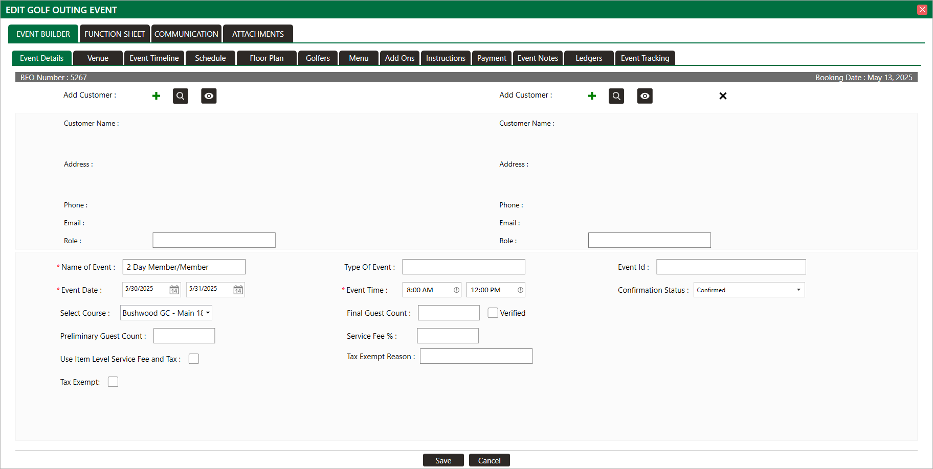 Step 2: The Golf Outing Manager shows a list of existing events. Under Action, click on the three small dots, followed by View/Edit. The System will generate an EDIT GOLF OUTING EVENT pop-up window.