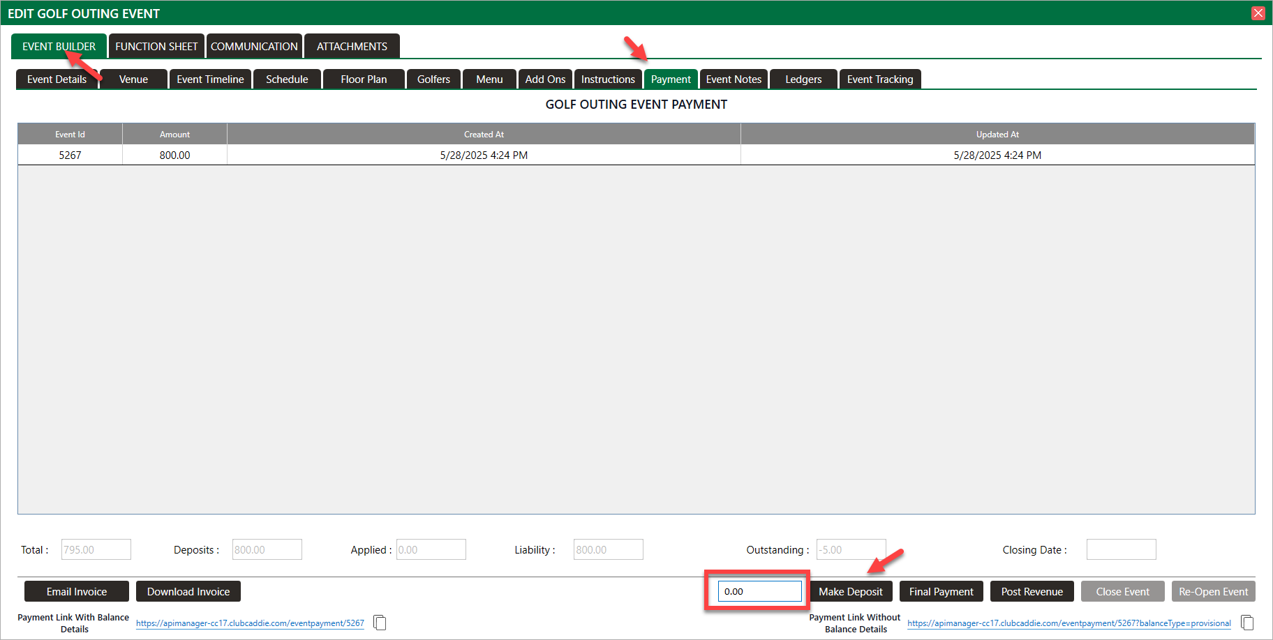 Step 3: Under the EVENT BUILDER tab, click on Payment. Fill in the payment amount and click on the Make Deposit button.