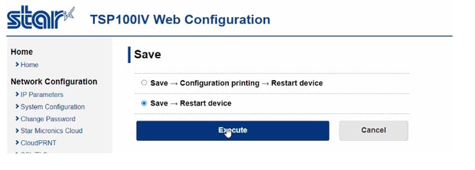 Choose Save > Restart device, then Execute (this restart is done from the printer’s web page, not on the physical printer).