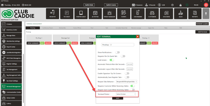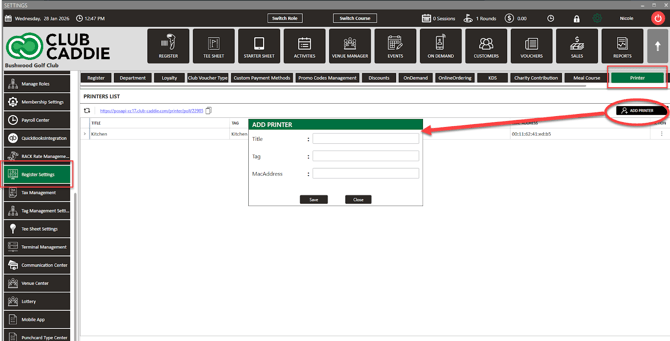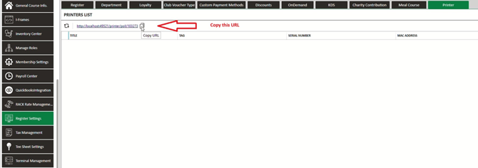 Used to copy the POS URL and add/edit printers (Title, Tag, MAC Address). - Club Caddie: Settings > Terminal Management