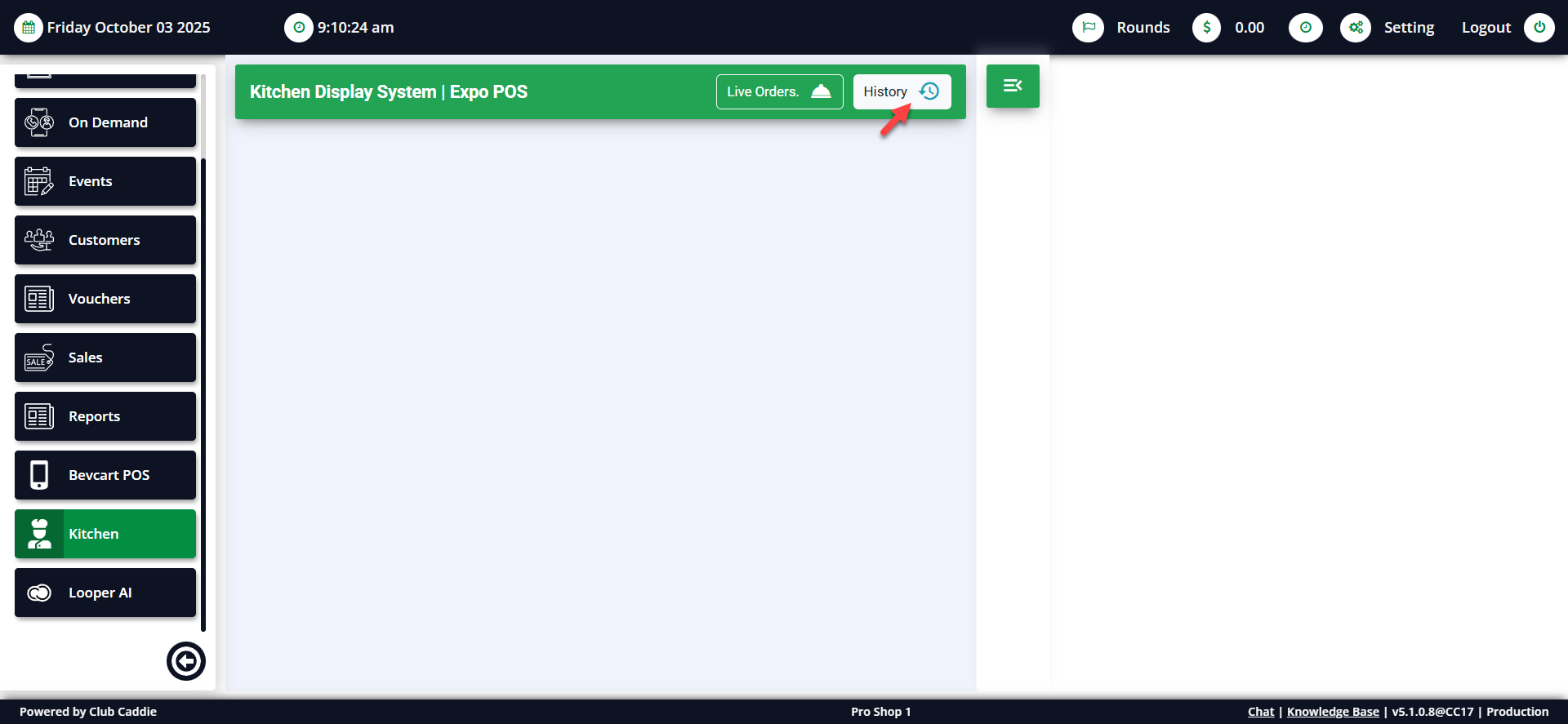 Step 2: Click on the History button in the top right corner to view the previous orders that were sent to the kitchen.
