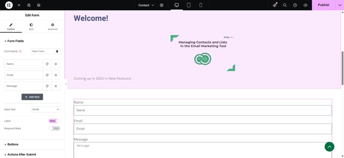 In the Elementor editor, scroll to the form on your page and click inside it. The form’s settings will appear in the left sidebar. Make sure you are on the Content tab so you can see the form panels.