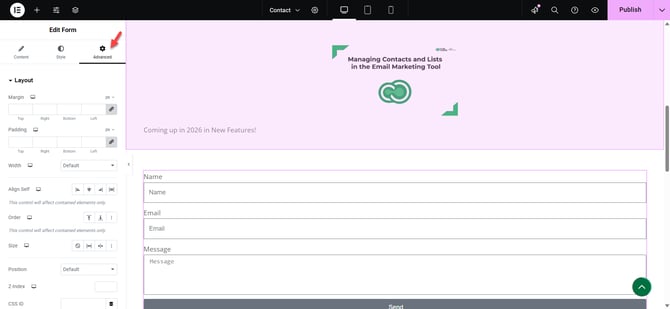 Go to the Advanced tab for the form or individual fields to fine-tune spacing. Use Margin and Padding to control space around the form and fields. You can also add Motion Effects (such as fade-in animations) and set responsive visibility rules (for example, hide certain elements on mobile if needed).