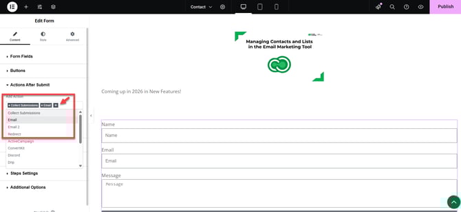 In the Content tab, find the Actions After Submit panel. Add or adjust actions such as Email, Redirect, Webhook, or Popup. These actions control what happens when a user successfully submits the form.
