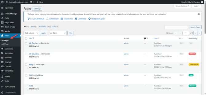 From the WordPress dashboard, click Pages, then click All Pages. Hover over the page you want to edit and click Edit with Elementor. If you are already viewing the page while logged in, click the Edit with Elementor button in the top admin toolbar.