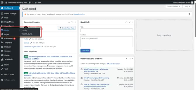 Log in to your WordPress admin dashboard. In the left-hand menu, click Media. You’ll see two sub-options: