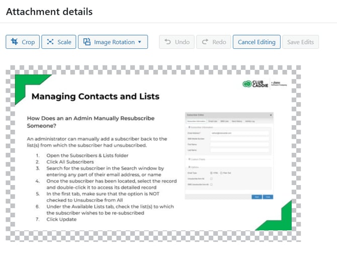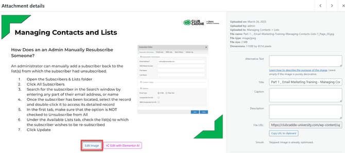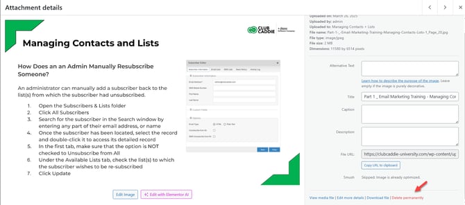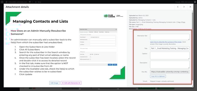 Click on any file in the Media Library to open the Attachment Details screen. Here you can: